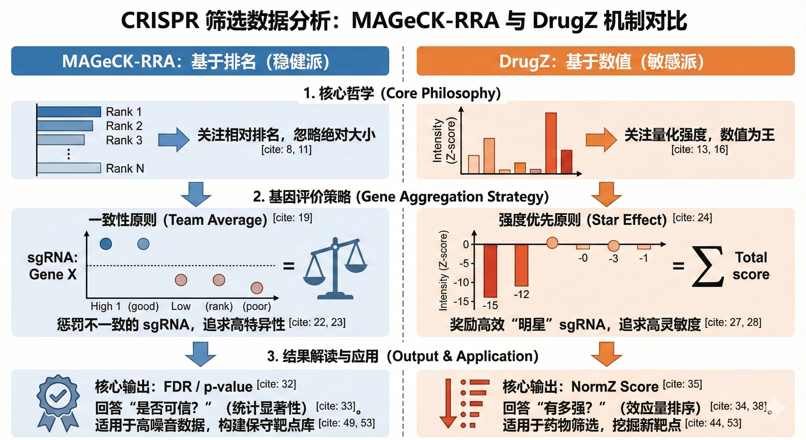 - 总结: DrugZ 极大地提高了 灵敏度。 它承认 sgRNA 效果不均一是实验常态,因此更容易发现那些由少数高效 sgRNA 驱动的真实阳性基因。这在药物筛选(Drug Screen)中尤为重要,因为药物处理下往往只有亲和力最高的 sgRNA 才会显示出剧烈变化。