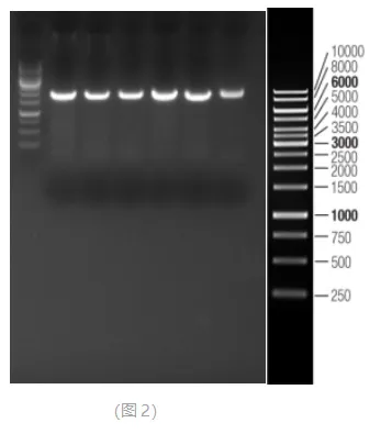 图 2 是对小鼠某个基因进行鼠尾鉴定的结果,取 5 μL 进行电泳,目的条带大小为2 k。胶图中的扩增条带明亮且单一,说明本产品获得的DNA模板足够用于鼠尾基因型鉴定,且扩增效果良好。