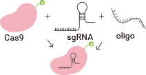 - ● 将sgRNA和Cas9蛋自在体外孵育形成RNP复合物,与单链oligo共转进细胞内。RNP造成靶点双链断裂后,oligo可通过同源重组的方式,将携带的目标突变引入基因组靶点。