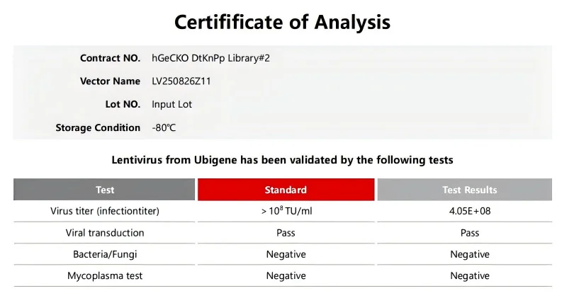 相应规格的文库病毒、病毒COA质检报告以及定制文库质粒NGS测序报告。