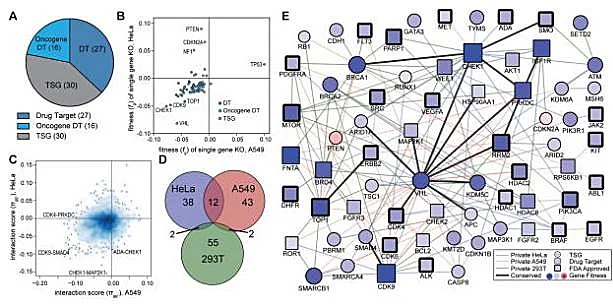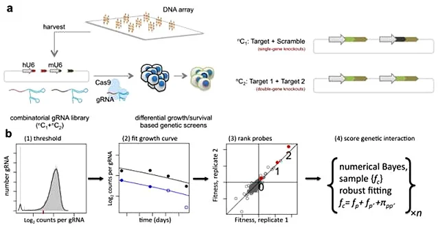 合成致死指当两个非致死性突变基因单独发生时不会导致细胞死亡,而同时发生时会引起细胞死亡的现象,是目前抗肿瘤药物领域新的研究方向之一。因为肿瘤细胞往往带有许多点突变,如何特异性地杀伤突变率高的肿瘤细胞而不影响正常细胞是抗肿瘤药物研发的一大追求。Shen等[2]从合成致死这一思路出发,设计了双重gRNA文库筛选出合成致死相互作用网络。与一般的sgRNA文库不同,双重gRNA文库中每个载体包含两条gRNA,一条靶向肿瘤中常见的突变肿瘤抑制基因,另一条靶向可以被抗癌药物扰乱的基因。他们运用该系统对3种实验癌细胞系(人宫颈癌Hela、肺癌A549和胚胎肾细胞癌293T)中的73个基因进行了筛选,共约150,000种基因组合,通过检测不同时间点gRNA丰度变化,进一步分析筛选出120种合成致死相互作用关系,为癌症新药的开发提供了新靶点。