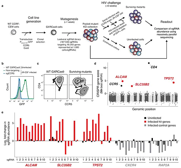 HIV病毒感染引发的艾滋病(AIDS)严重威胁着人类的生命健康,阐明HIV突破宿主细胞防御系统的分子机制、开发HIV治疗新靶点具有重大意义。Park等[3]在CCR5-hygR和HIV-1 LTR-GFP稳定表达的CCRF-CEM细胞上感染Cas9病毒,筛选出一株HIV感染前高表达CCR5、低表达EGFP但感染后高表达EGFP的克隆株(GXRCas9细胞)用作筛选HIV感染靶点的工具细胞。具体是使用包含187536条sgRNA (靶向18543个基因)的慢病毒文库感染GXRCas9细胞,再用HIV病毒株JR-CSF感染这些缺失不同受体的T细胞,随后流式分选出GFP阴性和阳性的T细胞,并对GFP阴性细胞群与未感染HIV病毒细胞群进行测序,分析两群细胞sgRNA的丰度差异,最后筛选出5个sgRNA丰度变化最大的基因。其中CD4和CCR5是HIV感染T细胞的受体,TPST2和SLC35B2对CCR5进行修饰为HIV的结合提供便利,而编码白细胞粘附因子ALCAM的基因则与HIV在细胞间的传播有关。筛选出的5个基因被敲除后均不影响T细胞的存活,但能使T细胞抵抗HIV的感染,因此这5个基因可作为HIV治疗的潜在靶标,为预防和治疗艾滋病提供新的理念和途径。