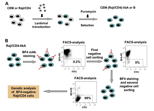 使用肽或纯化蛋白进行免疫实验验证抗体是相当简单的,但使用全细胞或其他复杂抗原进行免疫验证抗体则相对困难。如果Western blotting(蛋白印迹)和免疫沉淀中均未检测到抗体的反应性,则需要应用多种基因操作层面的技术来确定mAb的抗原特异性。BF4是一种能与未感染的淋巴细胞、中性粒细胞及HTLV-1感染细胞表面的病毒生物膜结合的抗体。Zotova等[4]以MT2细胞(人T细胞嗜淋巴病毒Ⅰ型HTLV-1慢性感染T细胞)作为免疫原触发小鼠免疫获得了一株HTLV-1生物膜特异性单克隆抗体BF4。他们基于通过向BF4阳性细胞中转导CRSIPR knockout 文库以筛选出BF4抗原被敲除的细胞的思路,在CEM T和Raji/CD4 B细胞上转导GeCKO文库,将不与BF4结合的细胞分选出来。经过两轮的重复分选后,阴性细胞比例达到了99%以上。研究人员对这部分细胞进行测序分析,发现约80%的sgRNA靶向了CD82。经验证确定BF4是CD82的特异性抗体。
